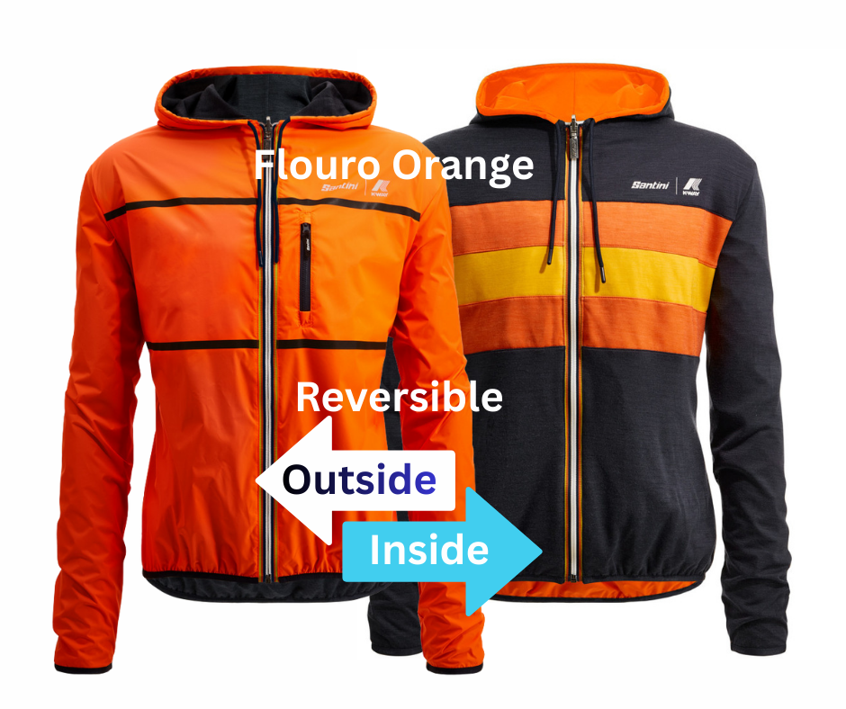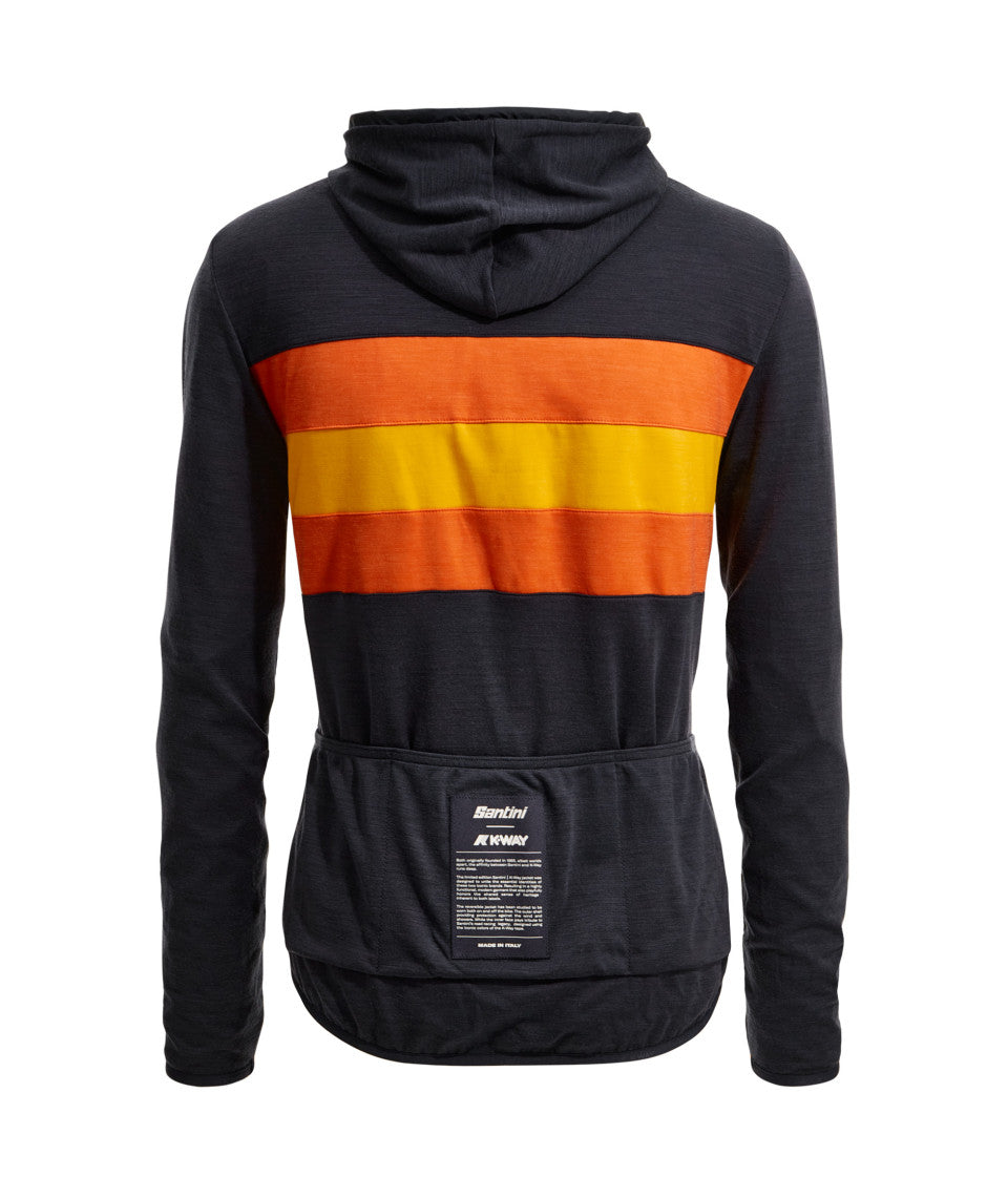 While the inner face pays tribute to Santini’s road racing legacy, designed using the iconic colors of the K-Way tape and made of a polyamide-wool blend fabric, which is very light but at the same time warm and breathable. This side features the typical 3 back pockets that are a distinctive feature of every cycling garment.