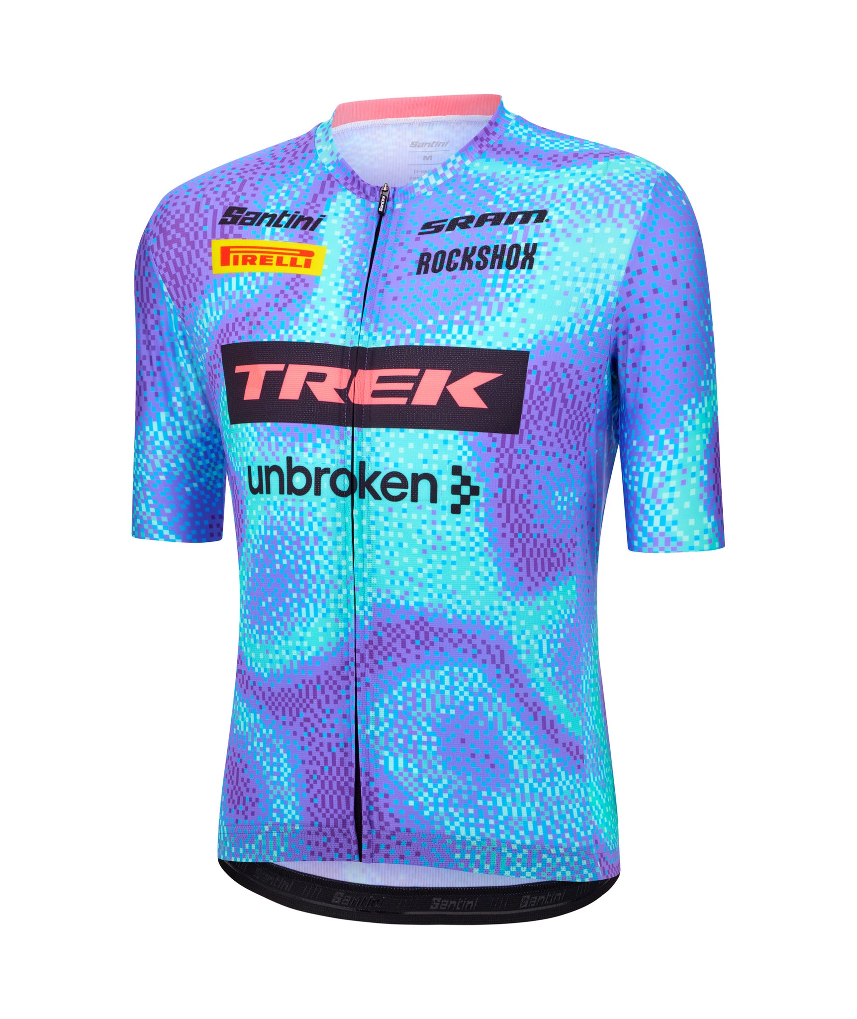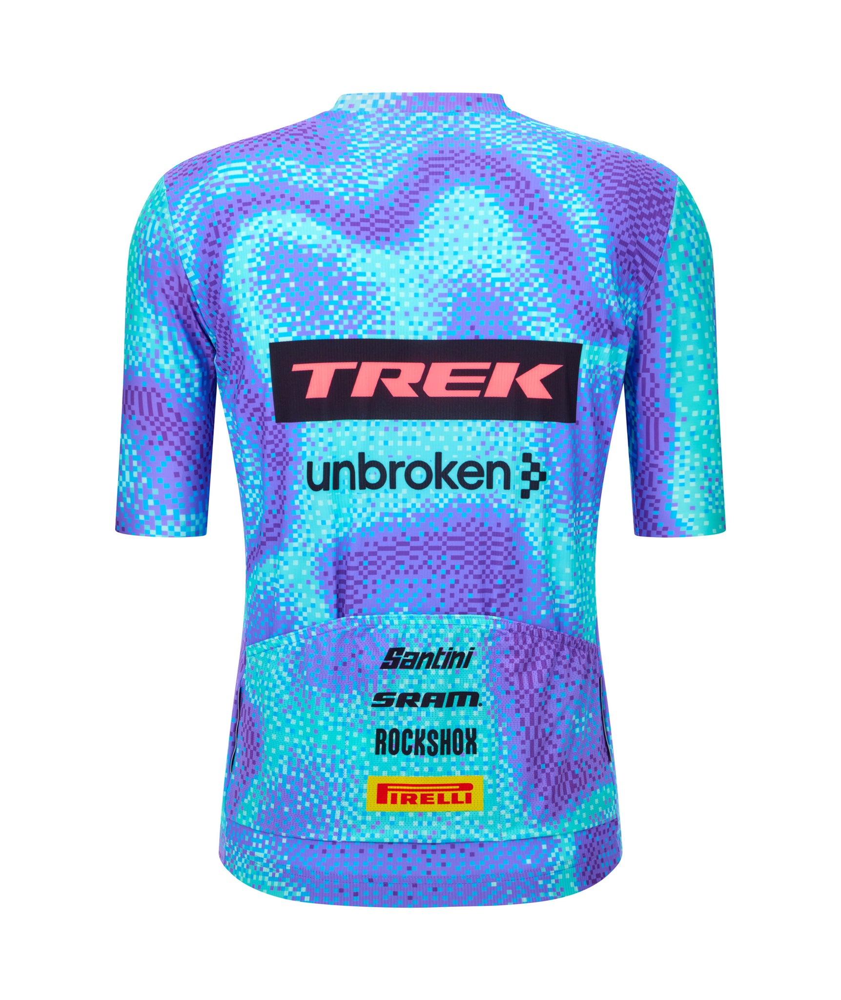 The Trek Factory Racing 2026 short-sleeve jersey represents the perfect balance between aerodynamics and comfort, designed for cyclists aiming for top performance. The lightweight, breathable front fabric ensures excellent heat regulation, while the smooth microfiber back and sleeves adapt perfectly to the body, following every movement without restriction. The raw-cut sleeves offer a seamless finish that reduces air resistance and enhances aerodynamic flow.
