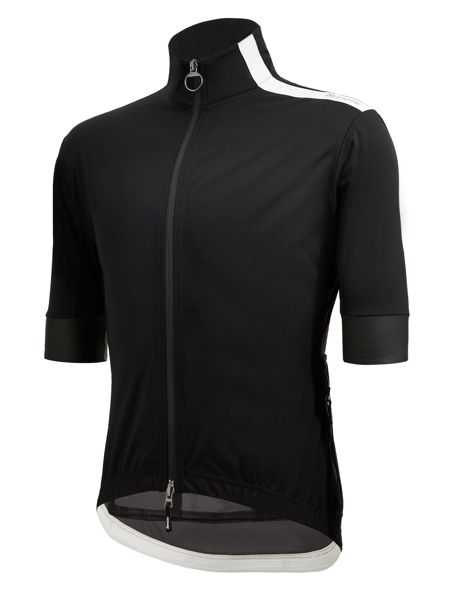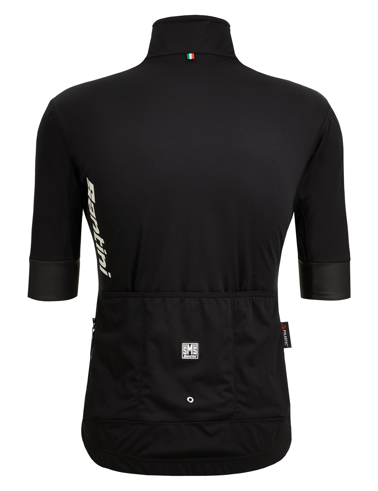 Ergonomically-cut with an aero fit. Sleeve cuffs created using an updated raw cut thermofleece fabric faced with a layer of water resistant polyurethane.Shaped rear splash guard, utilizing the same thermofleece-polyurethane fabric with additional high reflex Santini thermoplastic transfer.