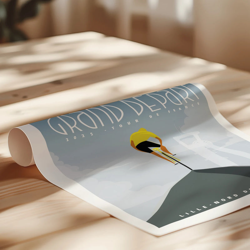 The 2025 edition of the Tour de France begins in Lille, in the heart of Hauts-de-France. This poster pays homage to the region and its mining past through a striking visual: a rider in a yellow jersey climbing a slag heap, a powerful symbol of the region.