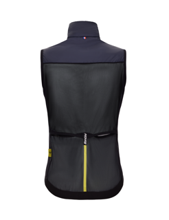 Windproof vest with aerodynamic fit ideal for mid-season weather. Back and lower front in stretch mesh to allow a perfect fit and extreme lightness. Inner lining in POLARTEC® Alpha thermodynamic fabric, extremely insulating, on top front and shoulders. Ideal for keeping the body protected and warm during the descent. Double rear opening to allow easy access to the pockets of your jersey.